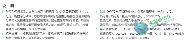 产品特性:I 测量精确:固定分类信号输入,已经各类信号的特点最大限度提升精度、分辨力及抗干扰能力,采用美国CS5523A/D转换器,保证了测量精度和速度;I EMC III:超强的抗干扰能力,适用各种复杂现场 *I 温漂优异:优异的温漂性能,10ppm;I 万能输入:电压、电流、热电阻、热电偶跳线万能输入I 宽幅电源:高效率宽电压的开关电源设计