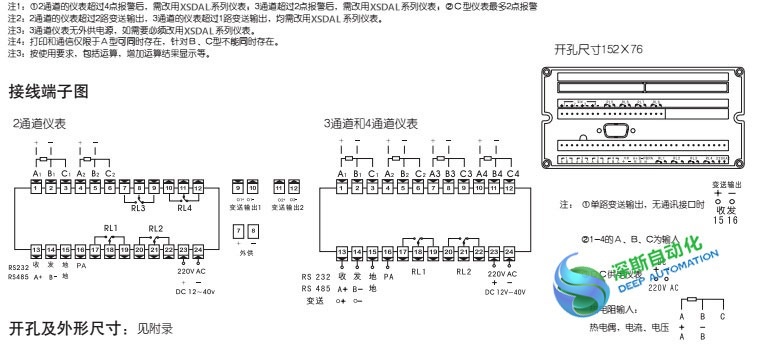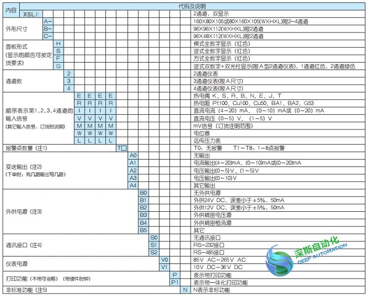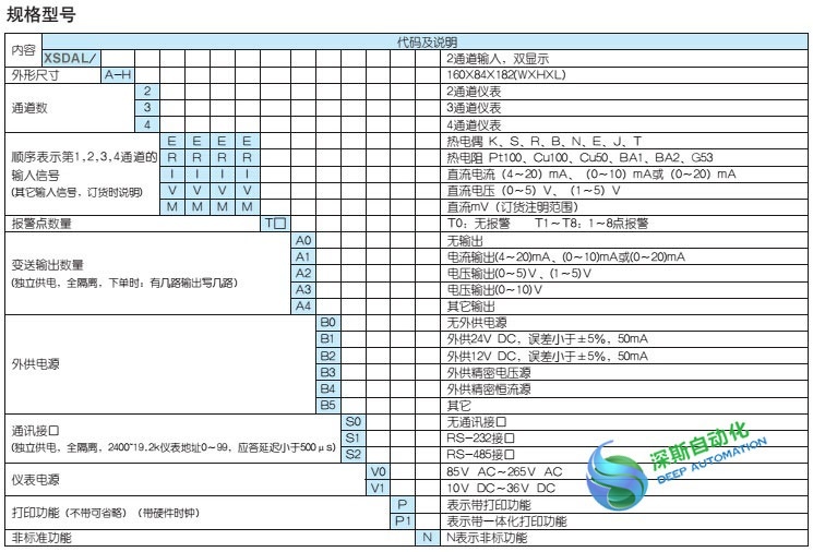 I 测量精确:固定分类信号输入,已经各类信号的特点最大限度提升精度、分辨力及抗干扰能力,采用美国CS5523A/D转换器,保证了测量精度和速度;I EMC III:超强的抗干扰能力,适用各种复杂现场 *;I 宽幅电源:高效率宽电压的开关电源设计 *;I 通讯可靠:带自诊断、自恢复的通讯接口。透明、高效、可靠;I 通道间运算:可通过参数设定对通道间的测量值进行加、减速(2通道仪表)、平均值、最大值以及最小值的运算;I 非标案例丰富:从满足用户的需要出发,积累了数百个非标应用案例,最大限度满足个性化的需求、降低系统成本、方便操作;I 组态报警:多达8点报警输出(XSDAL),并可通过参数设定分配到指定通道或运算单元;I 智能变送:最多4路隔离变送(XSDAL),将测量、变换后的显示值或运算单元的结果以标准电流、电压输出
